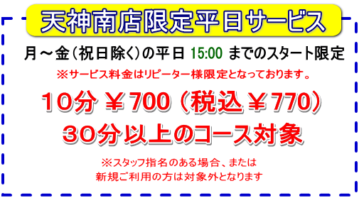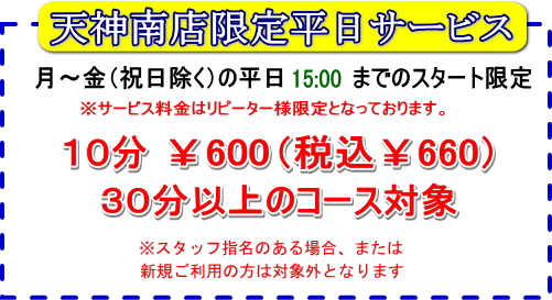 ※たとえば60分のご予約された方が30分遅刻した場合、施術時間は残りの30分しかお受け頂けませんが代金は60分相当額を